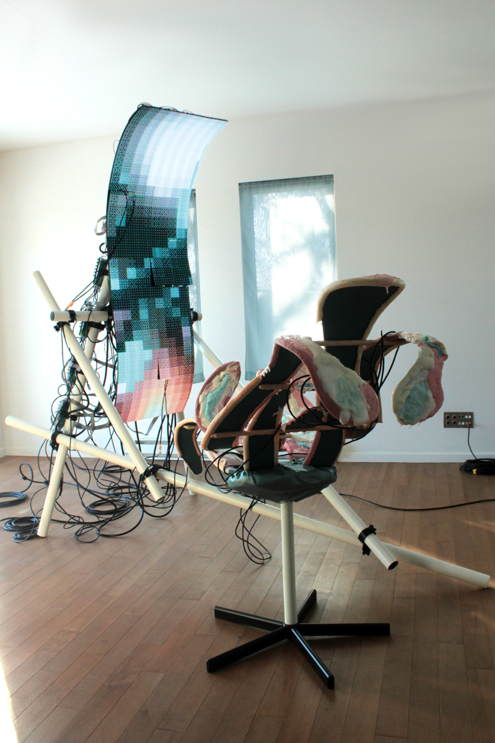 Portant un regard sur le positionnement du corps par rapport à l’écran, L’ordinateur prend la forme d’un poste de travail personnel éclaté devant lequel sont posés des fauteuils aux courbes humanoïdes. À travers l’abondance de câblage de cet ordinateur hors du commun, deux écrans de modules de DEL souples sont soutenus par un ensemble de tubes rappelant à la fois des modules de jeu et des équipements médicaux. Ces stations, formant un réseau occupant l’entièreté de la salle, sont connectées à des composantes informatiques coussinées flottant dans une structure cubique. L’éclatement du réseau dans l’espace, la forme courbe donnée aux deux écrans et les propriétés propres au type d’écran utilisé soulignent la matérialité du numérique, qui soudain semble devenir plus tangible.